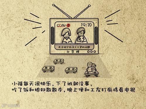 小强每天很快乐,下了班就没事,吃了饭和媳妇散散步,晚上便和工友打麻将看电视。