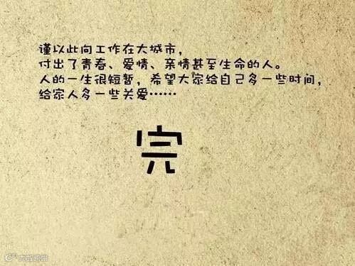 谨以此日志献给工作在大城市,付出了青春、爱情、亲情甚至生命的人们。人的一生真的很短暂,希望大家给自己多一些时间,给家人多一些关爱!