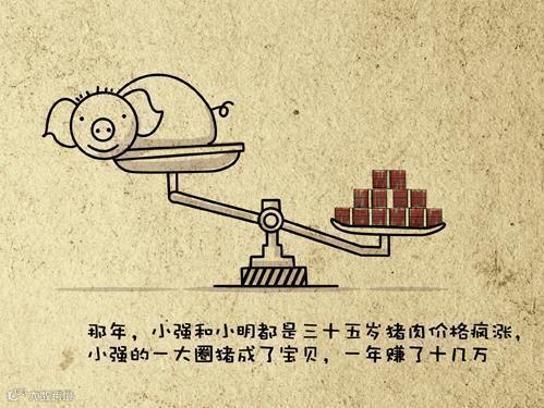那年,小强和小明都是三十五岁。猪肉价格疯涨,小强的一大圈猪成了宝贝,一年赚了十几万。