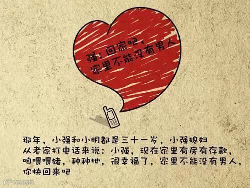 那年,小强和小明都是三十一岁。小强媳妇从老家打电话来说:小强,现在家里有房有存款,咱喂喂猪,种种地,很幸福了,家里不能没有男人,你快回来吧。