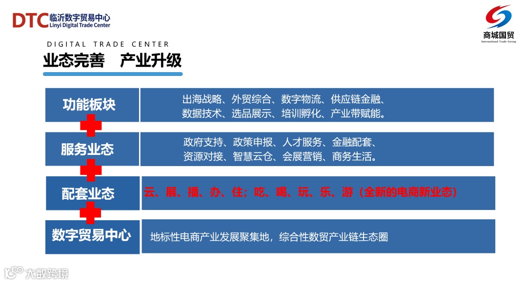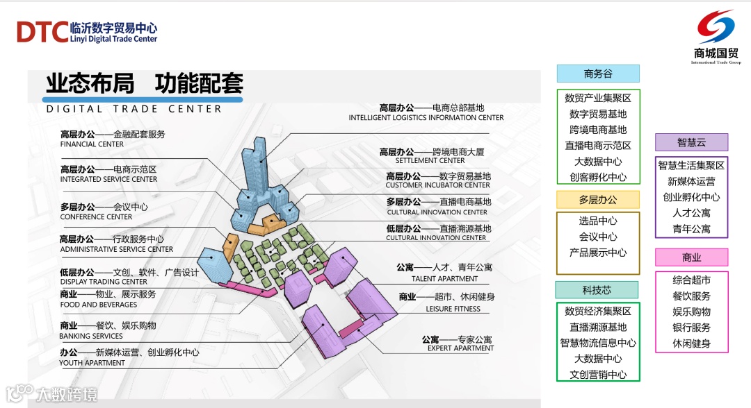 临沂数字贸易中心(DTC)功能布局清晰、配套完善,聚焦直播电商、跨境电商、国际贸易、数字经济四大产业打造“一港两基地”,布局出海战略、外贸综合等八大功能板块;规划数贸经济集聚区、智慧生活集聚区等功能分区,配备大数据中心、直播溯源基地、跨境电商大厦、国际贸易交流中心等专业产业载体,同时配套人才公寓、金融服务、餐饮休闲、健身娱乐等完善的生活商务设施,打造“云、展、播、办、住”的全新电商业态,构建起综合性的数贸产业链生态圈。