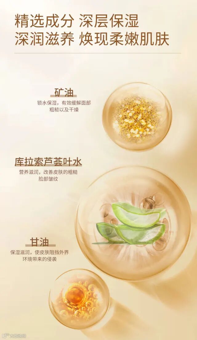 【成分】矿油、甘油、库拉索芦荟叶水、酵母菌发酵产物、乙酰基六肽-8等;