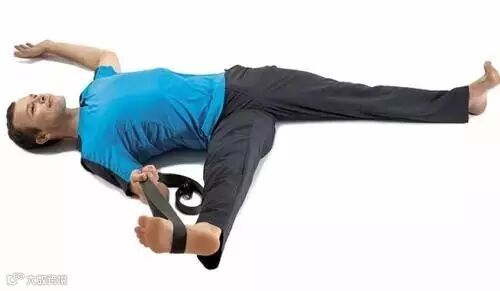 返回右侧,右手抓住瑜伽绳的两端,左手臂贴着地面向外伸展。呼气,把你的右腿向外尽可能放低至右侧地面。尽量保持左髋贴在地面上,左膝盖骨指向天花板。你应该感到右大腿内侧深处有拉伸的感觉,而下背部是放松的。保持5个呼吸。最后,吸气并抬起右腿返回;呼气全身放松返回地面。然后换另一侧。