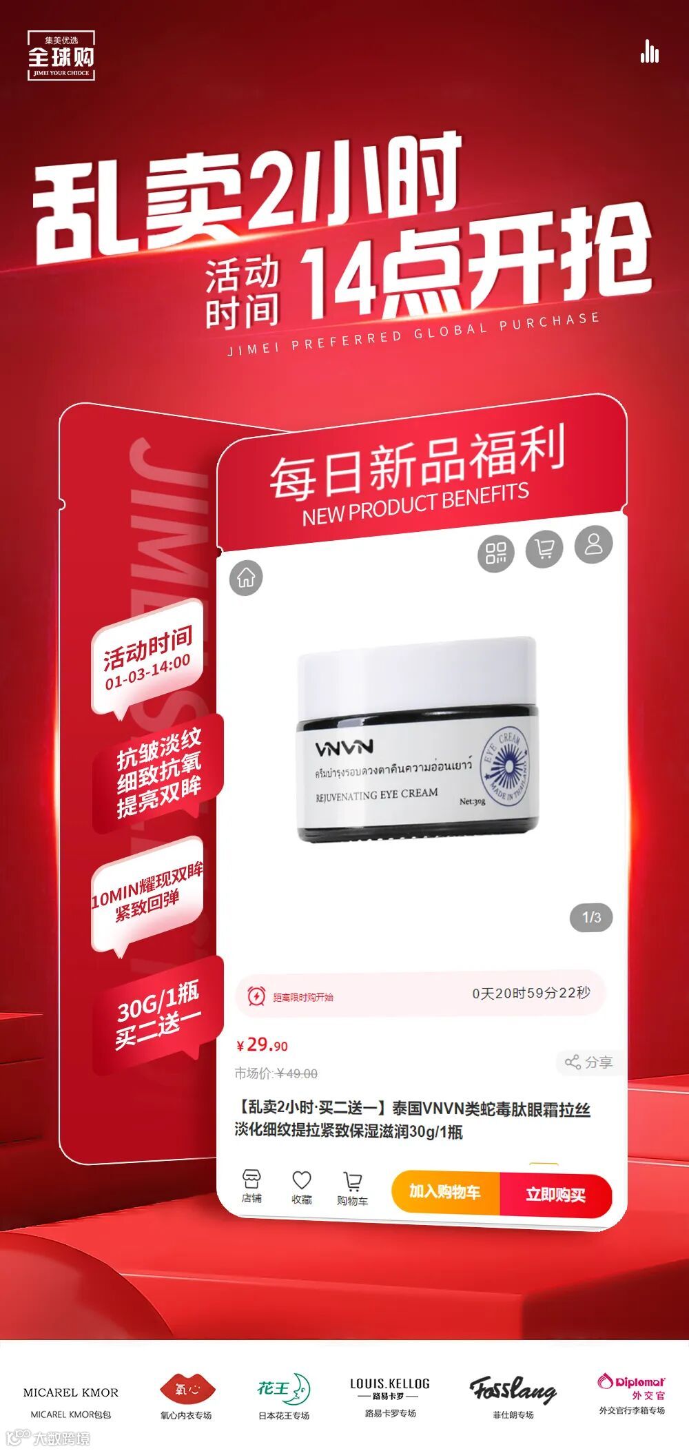 【乱卖2小时·买二送一】泰国VNVN类蛇毒肽眼霜拉丝淡化细纹提拉紧致保湿滋润30g/1瓶