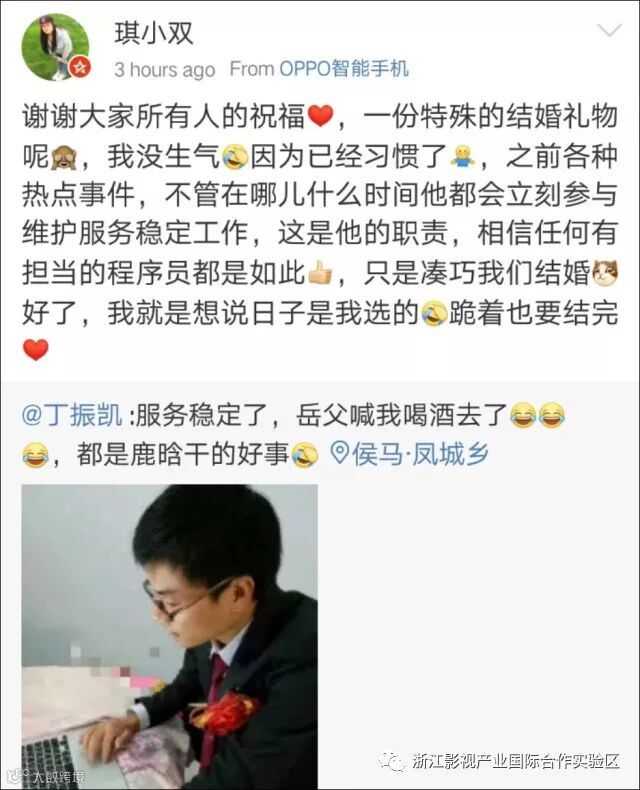 微博逢“大八卦”就瘫痪也不是什么新闻啦,但这次有些不同。8日下午,微博网友@丁振凯 发微博称,自己一边结婚一边扩容,并有照片为证,貌似正是微博加班程序员中的一员。服务稳定后,@丁振凯 又发布微博称,“岳父喊我喝酒去了,都是鹿晗干的好事”,微博CEO的转发也间接验证了这位网友的身份。