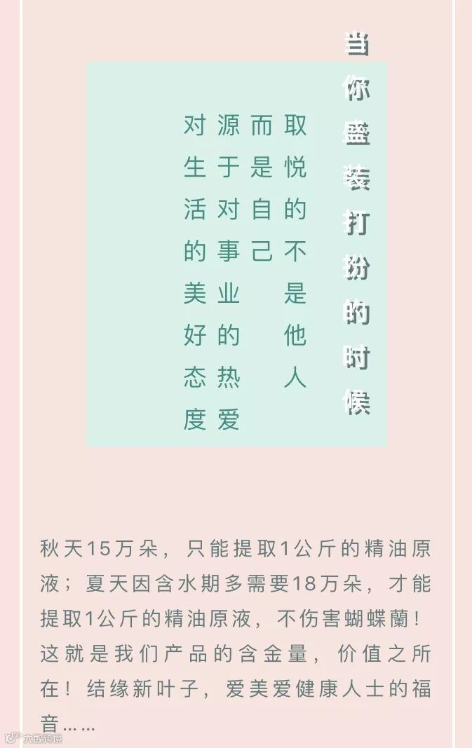 秋天15万朵,只能提取1公斤的精油原液;夏天因含水期多需要18万朵,才能提取1公斤的精油原液,不伤害蝴蝶蘭!这就是我们产品的含金量,价值之所在!结缘新叶子,爱美爱健康人士的福音……