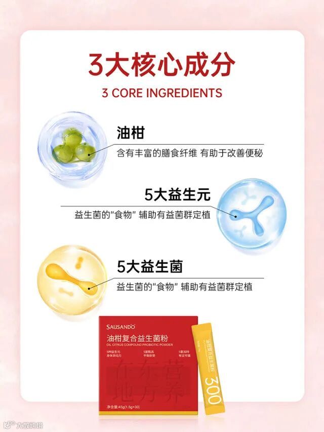 产品成分:低聚果糖、水苏糖、低聚木糖、油柑粉、聚葡萄糖、菊粉、脱脂奶粉、益生菌冻干粉 (非活菌型) (植物乳杆菌JYLP-326、鼠李糖乳杆菌JYLR-005、乳双歧杆菌JYBR-390、凝结芽孢杆菌BCN019、嗜酸乳杆菌JYLA-191)、DL-苹果酸等