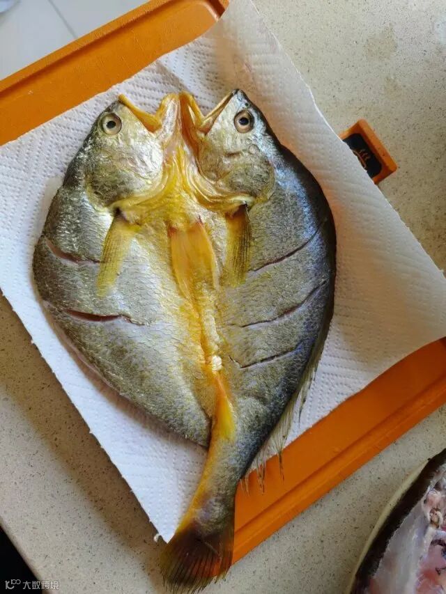 ①黄鱼鲞不开袋放入清水中自然解冻后,用厨房纸吸干水分放入盘中。