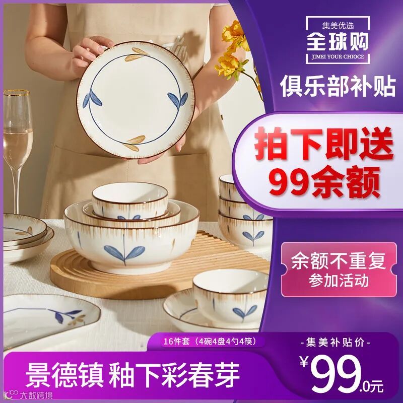 【俱乐部补贴】景德镇 釉下彩春芽16件套(4碗4盘4勺4筷)