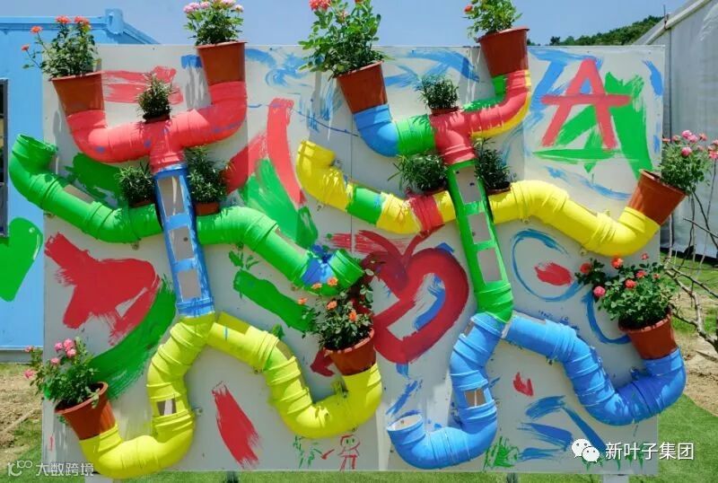 穿过泳池,行走在路边,也会发现惊喜。水管摇身一变成了装饰性极强的花墙,在水管外层涂上不同的颜色,组成了小人的形状,在水管出口处摆上花盆,既是废物利用,也充满了童趣。