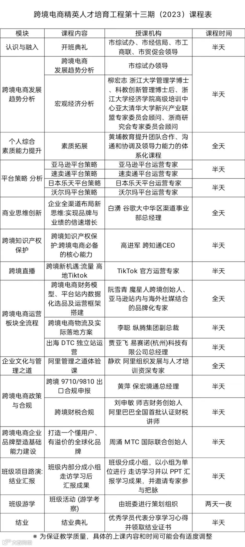 2023跨境电商精英人才培育工程第十三期培训班包括模块:名师授课、素质拓展、班级游学。通过设置丰富实用的培训课程,结合党政界、企业界、知识界、媒体界四界联动的特色优势,为全市跨境电商企业搭建学习、交流、成长和后续服务为一体的服务体系,培育一批有影响、有社会责任的跨境电商人才。