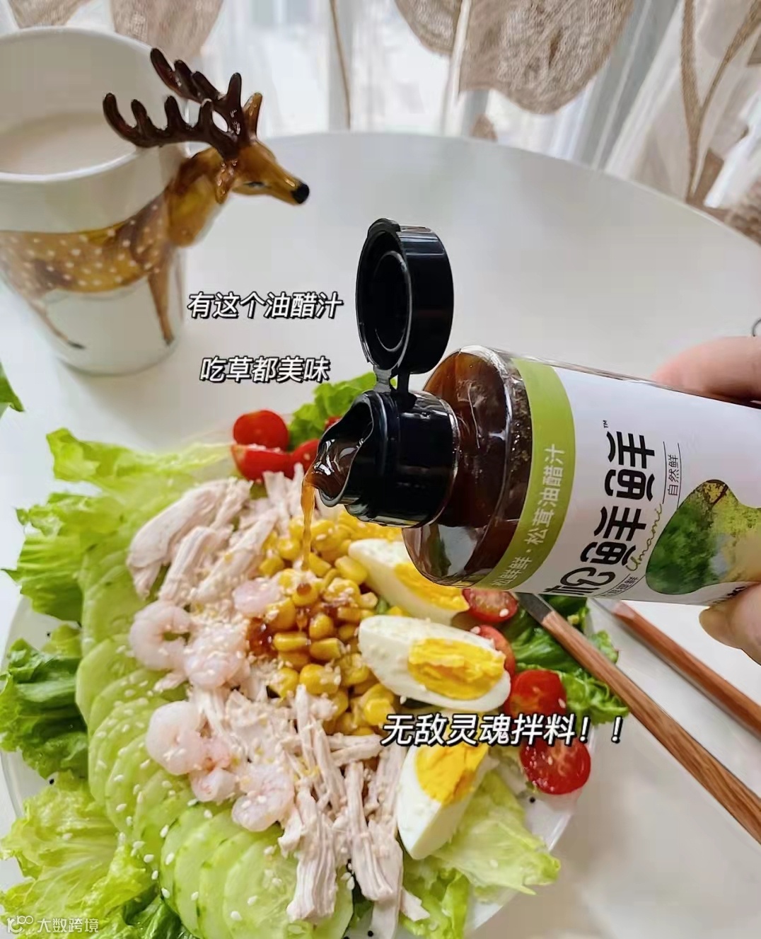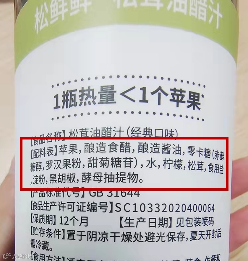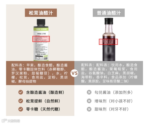 有一些沙拉是搭配油醋汁酱料的,但市面上的油醋汁,就算是主打低脂低卡的,去看它详细的配料表就会发现,为了让味道更鲜美,它们加了很多的添加剂,宣传是0脂,却还是加了很多白砂糖