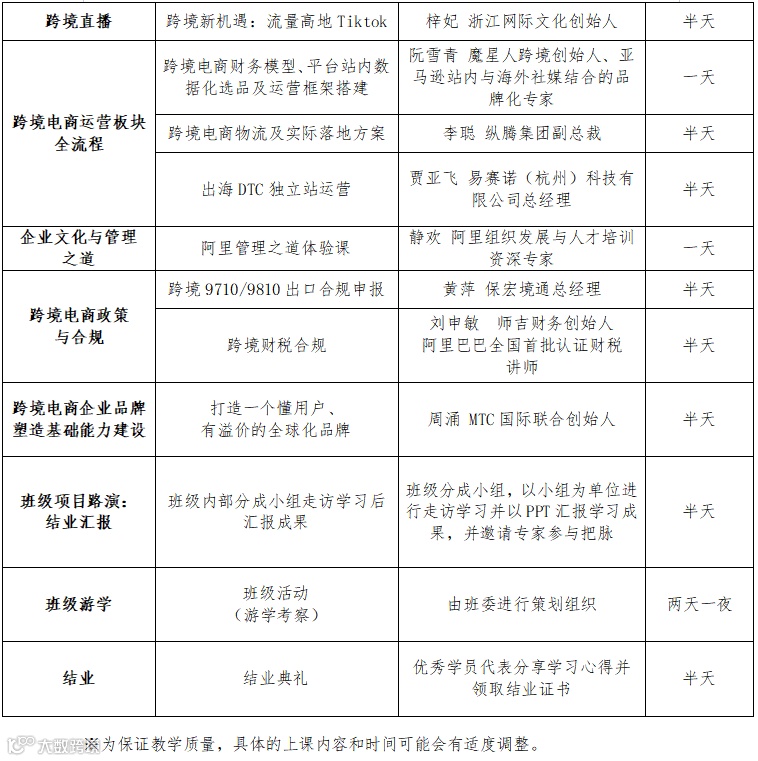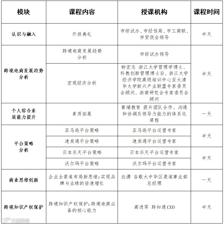 针对在杭跨境电商的发展现状与需求,结合互联网时代特征和当前国家发展战略和政策趋势,立足“跨境电商”发展现状和未来趋势,把握关键节点,从产业发展、品牌战略、团队管理、股权融资、国际物流、知识产权等方面提升学员专业知识的同时,结合案例分析、实地考察交流、现场教学等环节全方位提升学员的综合实操能力。