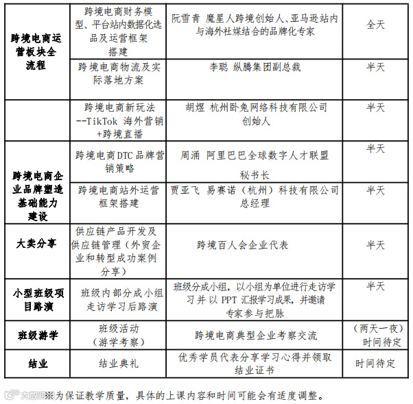 2022跨境电商人才培育工程第十期培训班包括模块:名师授课、素质拓展、班级游学。通过设置丰富实用的培训课程,结合党政界、企业界、知识界、媒体界四界联动的特色优势,为全市跨境电商企业搭建学习、交流、成长和后续服务为一体的服务体系,培育一批有影响、有社会责任的跨境电商人才。
