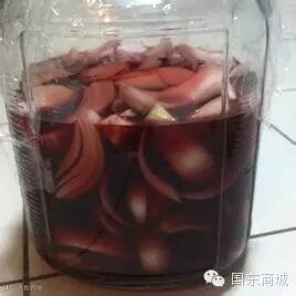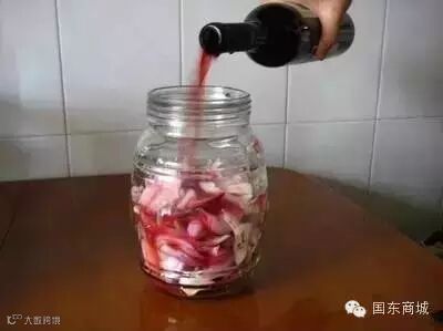 将洋葱洗净,去掉表面茶色外皮,切成八等份约半月形。1瓶普通干红葡萄酒配三个葱。将洋葱装入玻璃瓶内,加入干红葡萄酒,(将剥下来的外皮也一起加入效果更好)。将玻璃瓶盖好密封,在阴凉地方放置约2至8日(泡时间越长,怪味道越重)。将玻璃瓶的洋葱片,用滤网过滤后,洋葱、酒分开装入瓶中,再放置在冰箱中冷藏。