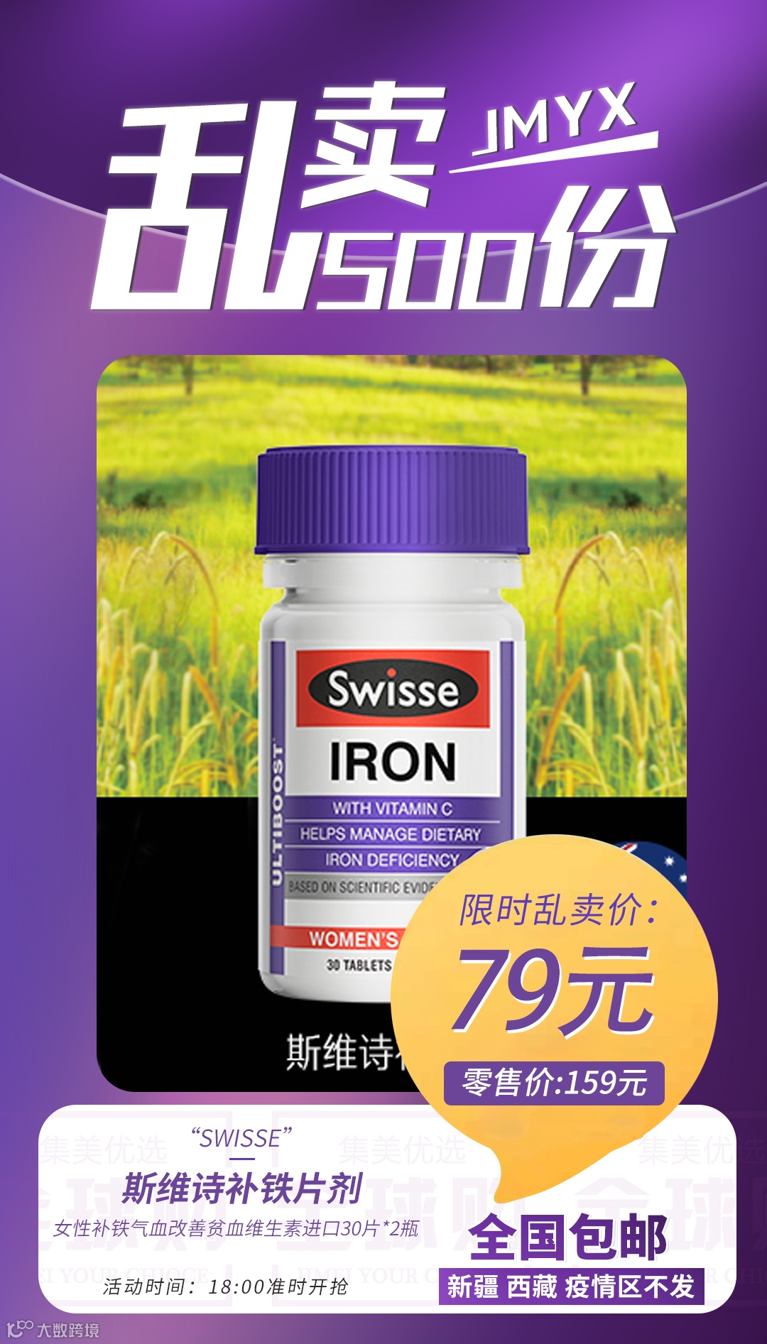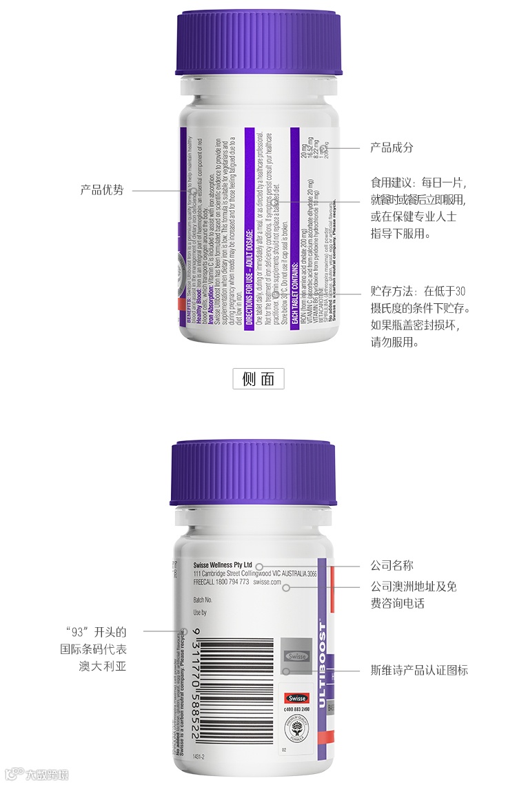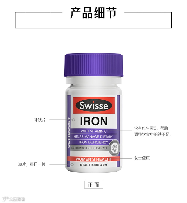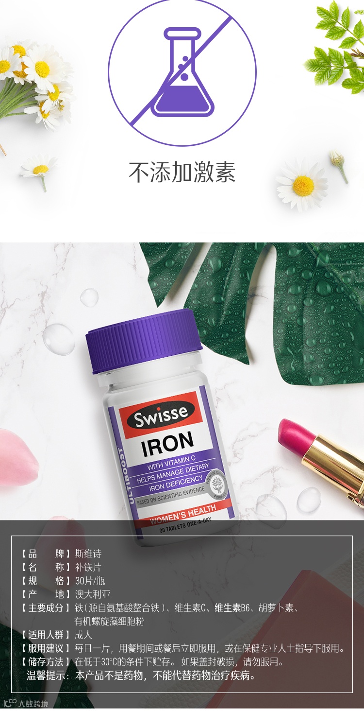 【粉丝群补贴】swisse斯维诗补铁片剂女性补铁气血改善贫血维生素进口30片*2瓶 原价:159元 粉丝群补贴价:79元