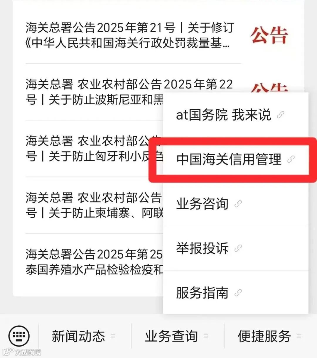 方式三:点击“12360服务”微信公众号下面的“便捷服务—中国海关信用管理”按钮。