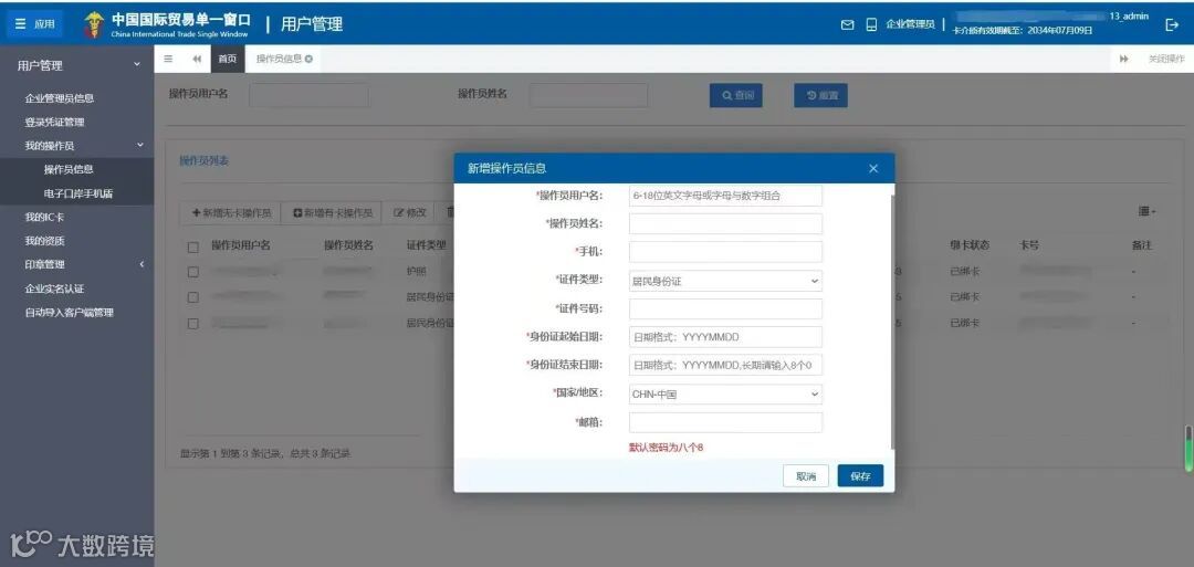 新增企业操作员账号:使用“单一窗口”用户管理系统,找到“操作员信息”功能模块,按指引录入操作员信息。