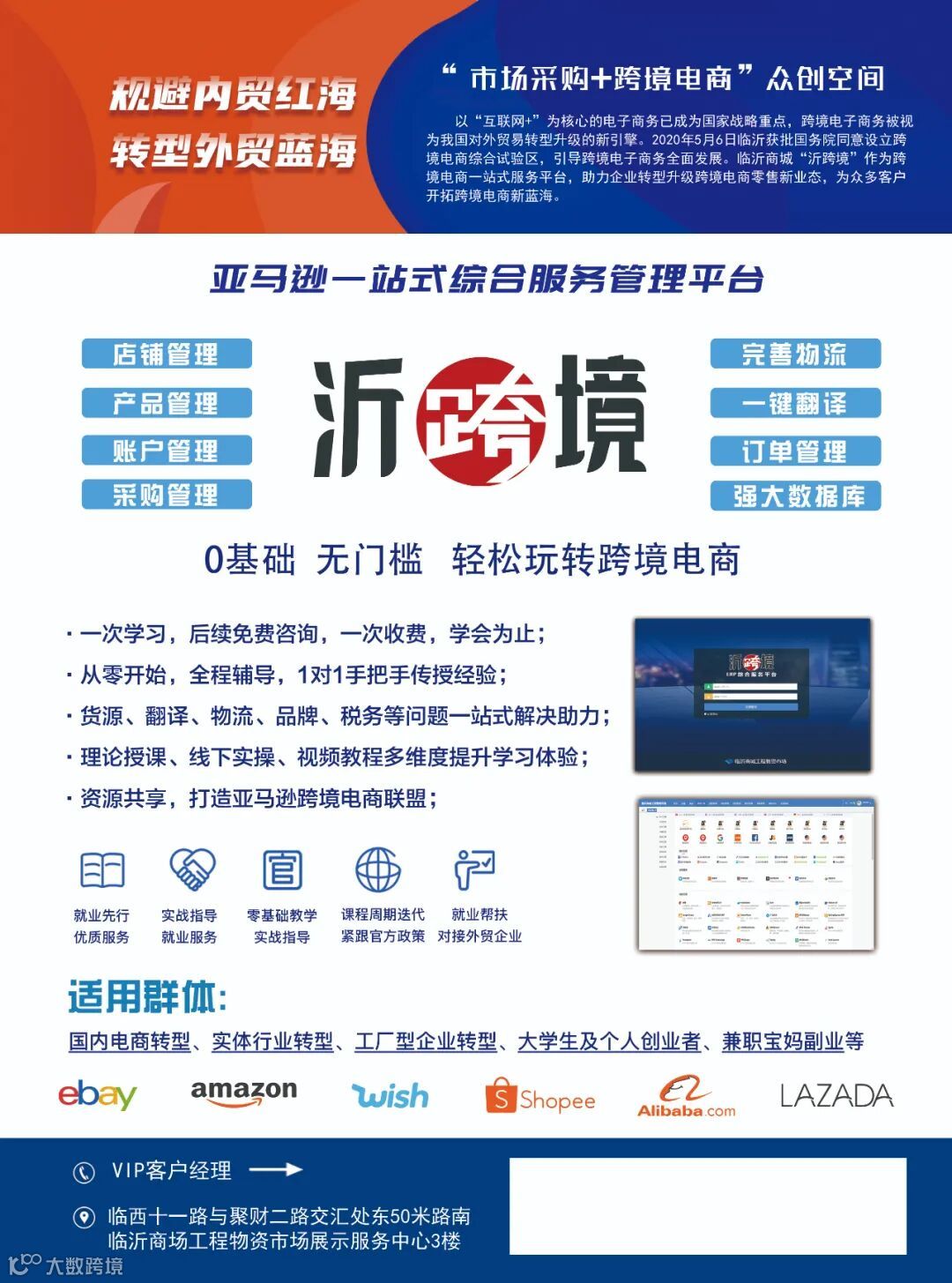 “沂跨境”一站式跨境电商综合服务平台是依托临沂商城工程物资市场“市场采购+跨境电商”众创空间发展模式打造的ERP平台,平台可助力0基础入门经营者轻松玩转跨境电商。
