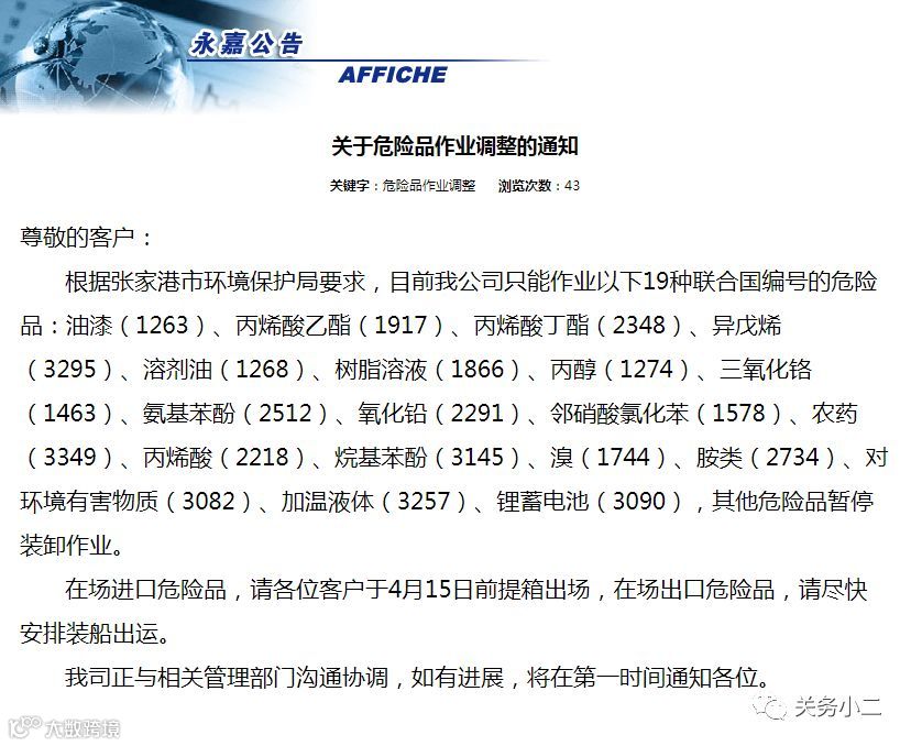4月1日,张家港永嘉集装箱码头有限公司发布通知,张家港码头自4月1日起暂停危险品装卸作业(除通知中19种危险品)。具体通知如下: