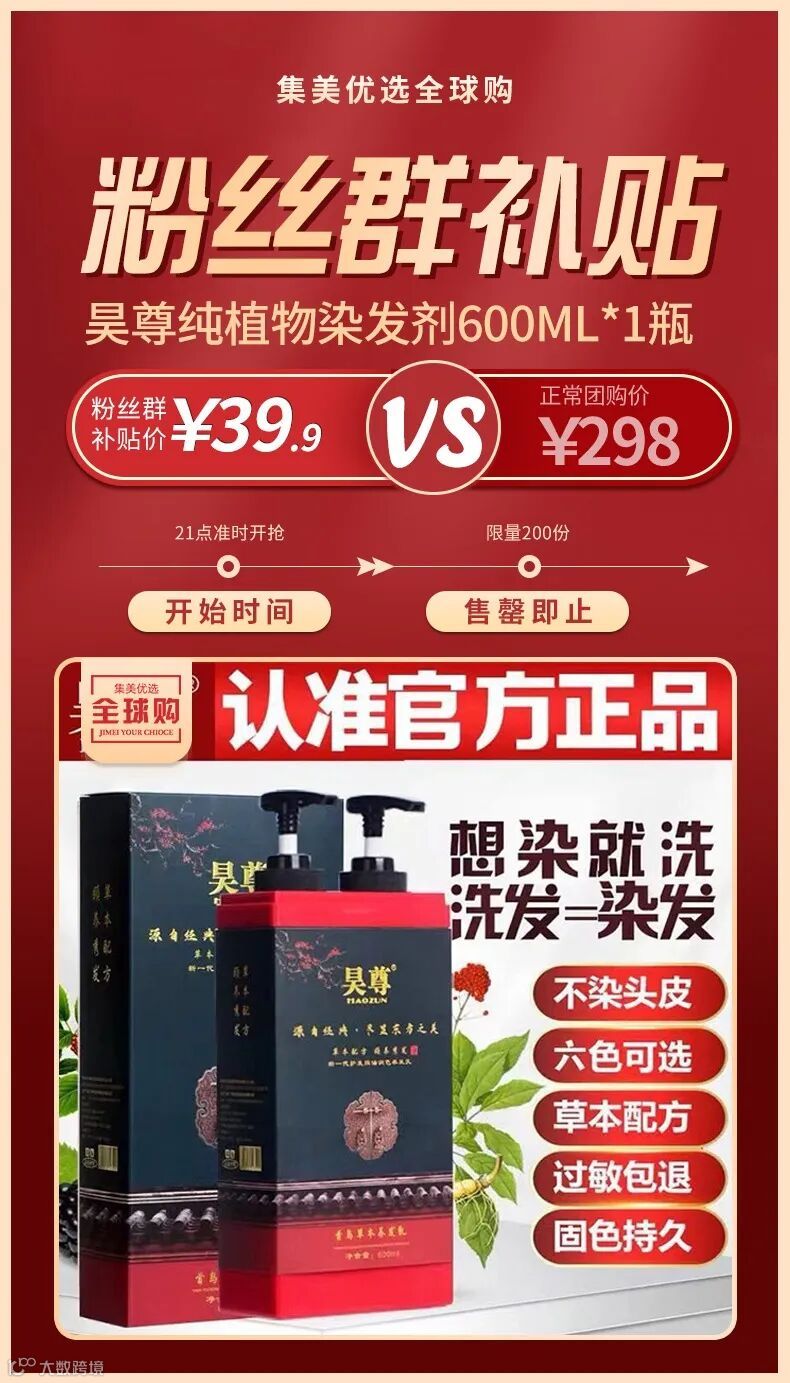 【粉丝群补贴】昊尊纯植物染发剂-洗彩白转黑流行色洗发水染发膏洗出彩600ml*1瓶 原价:298元 粉丝群补贴价:39.9元