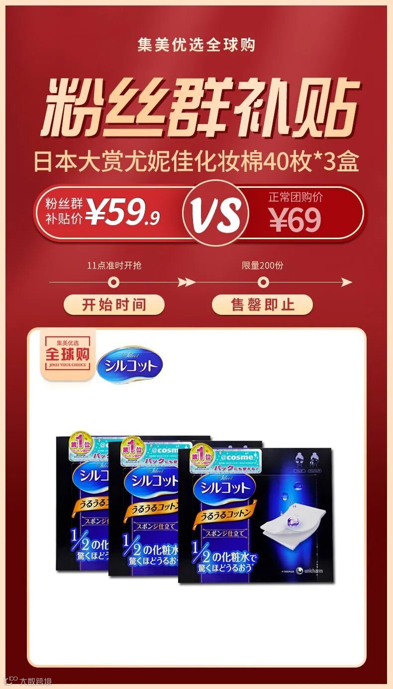 【粉丝群补贴】日本cosme大赏尤妮佳化妆棉二分之一化妆棉40枚*3盒 原价:69元 粉丝群补贴价:59.9元