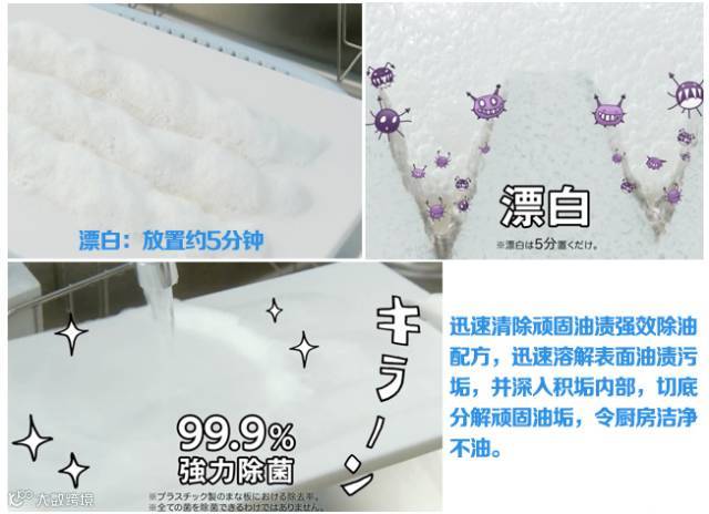 这款号称30秒强力去污杀菌的厨用喷剂深得我心,使用简单,厨房漂白剂喷雾型(氯),可以对厨具砧板,锅或其他渠口垃圾进行消毒,漂白,除臭,只需30秒,即可强力消毒切菜板上99.9%的细菌!※塑料菜板不可用