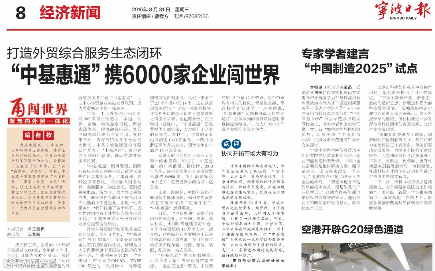 “中基惠通”调研发现,围绕外贸服务的互联网平台,通常仅聚焦在出口基础服务、订单管理、在线投保等板块,很少融入财务结算、金融服务、物流管理,更别提跨境电商、海外仓、国内外会展组展等。能不能在互联网上整合出口产业链的上下游企业,实现一站式服务?“我们打通了各个环节,成功构建国内首个外贸综合服务生态闭环。”中基宁波集团股份有限公司副总经理应秀珍说。