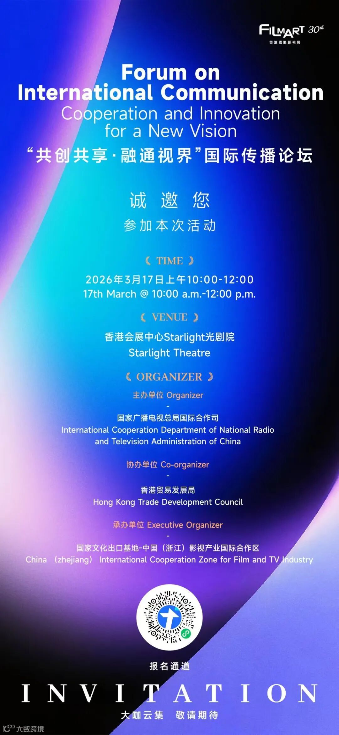 3月17日,第30届香港国际影视展(FILMART)举办期间,由国家广播电视总局国际合作司主办,香港贸易发展局、中国广播电视香港记者站协办,国家文化出口基地中国(浙江)影视产业国际合作区承办的“共创共享・融通视界”国际传播论坛,将在香港会展中心Starlight光剧院正式举行。