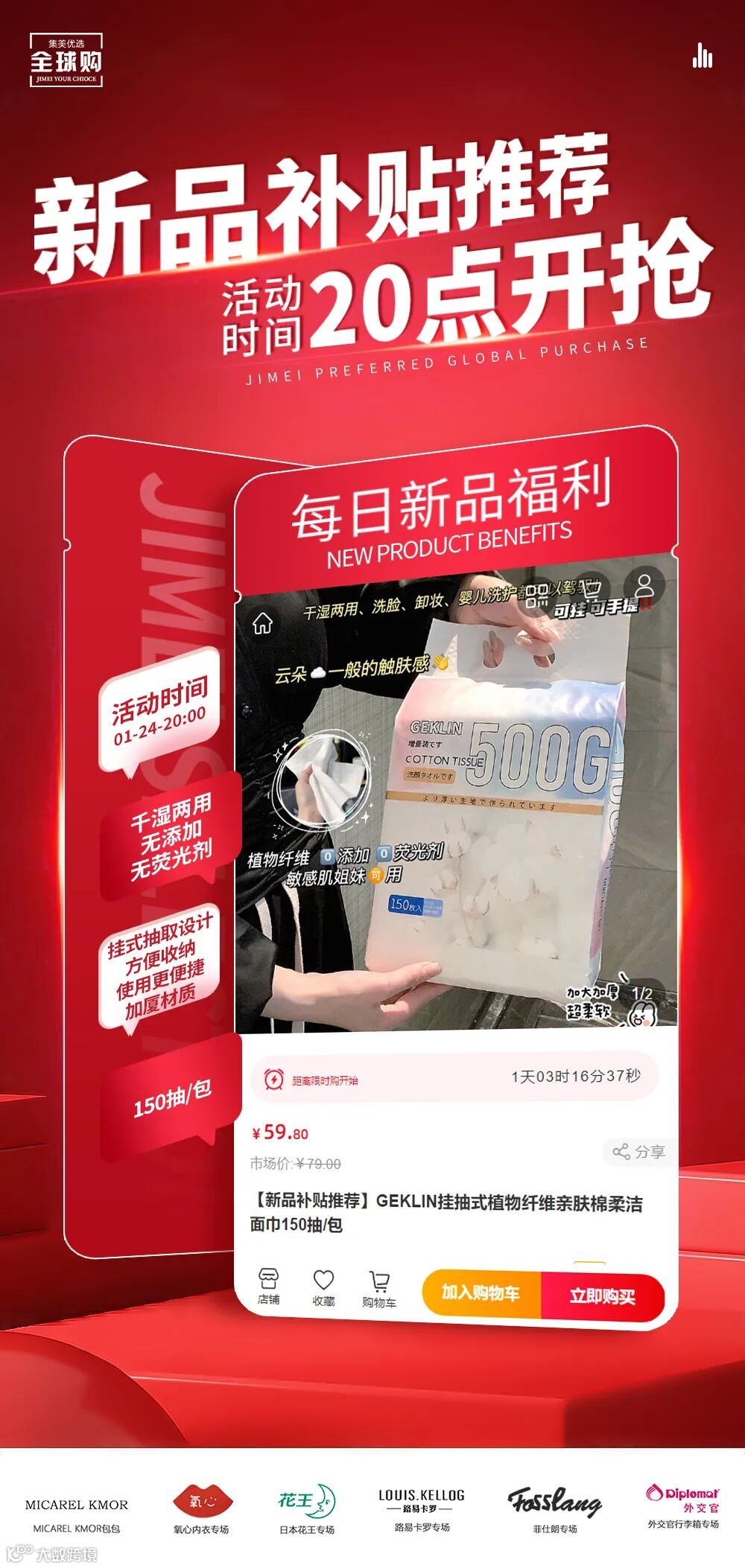 【新品补贴推荐】GEKLIN挂抽式植物纤维亲肤棉柔洁面巾150抽/包