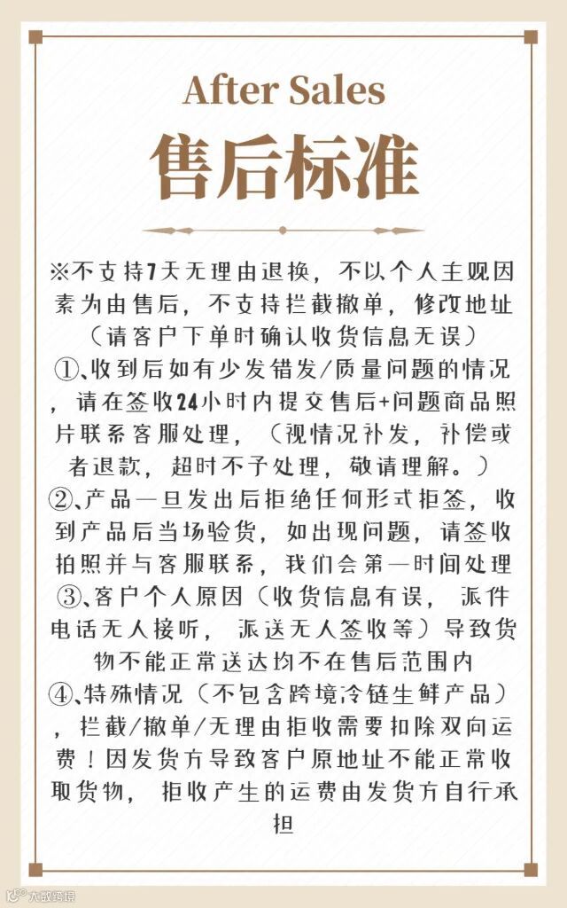 【售后说明】生鲜产品不适用7天无理由退换货,有问题签收后48小时内和客服沟通;如破损漏发,需提供快递外包装、面单及收到的产品图片商品详情;如遇产品问题售后,需提供产品的生产日期、批次、产品背后标签图片,必要时需要寄回;