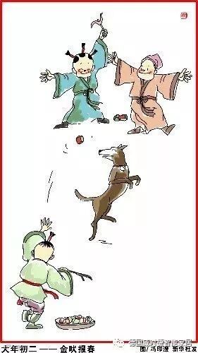 大年初二,金吠报春。亲眷人家去拜年,东家留吃饭、西家排酒筵。