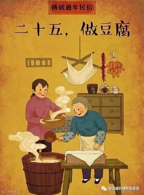 腊月二十五,推磨做豆腐。传说玉帝会下界查访,吃豆腐渣以表清苦。