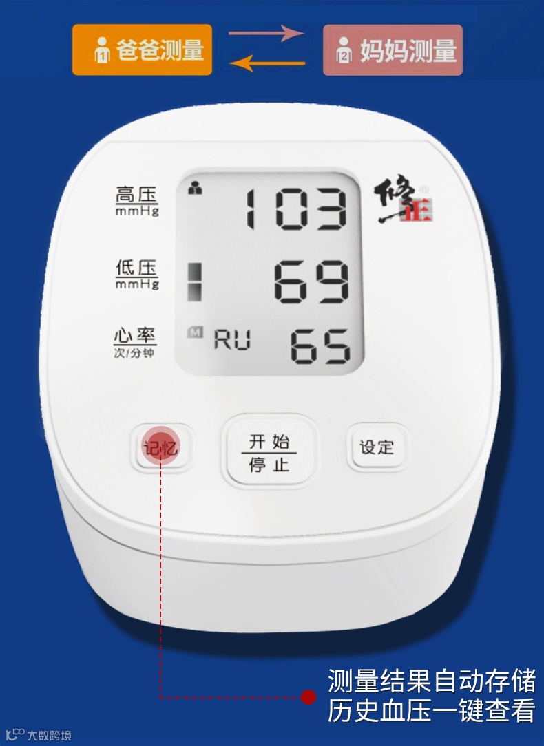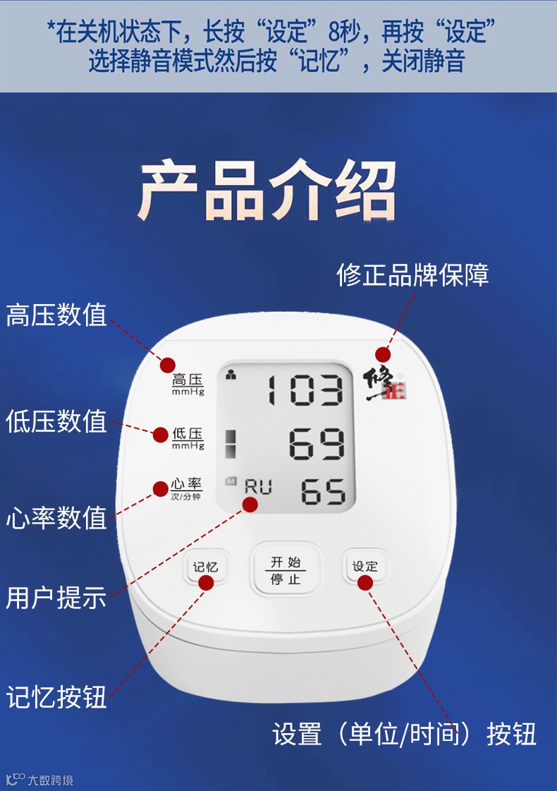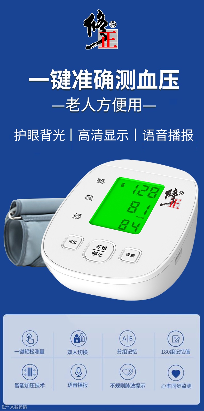 3、修正出品,精准品质,医药企业,国家认证,医院同名,从水银到电子,专注血压标准研究,科学管理血压,医用同款,用心守护家人。