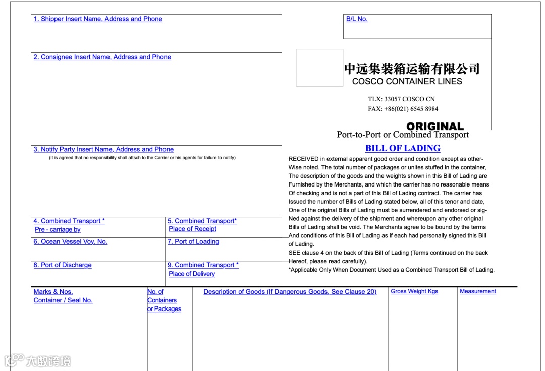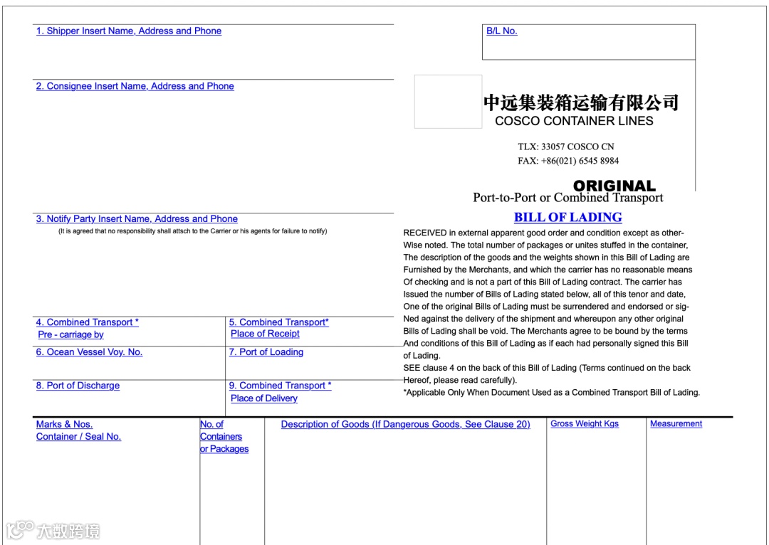 提单就是货物交付货运公司以后,由货运公司出具的证明,用以代表物权,以及在目的地提货。每个船公司都有自己式样的提单,但内容则大同小异。提单是最核心单证,某种意义上就是货物的代表,货款的价值。