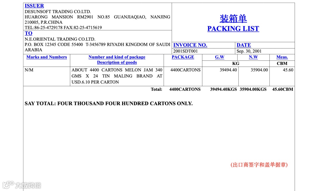 与外贸发票对应,性质一样,主要用于说明货物的包装情况,如品名、数量、包装方式、毛重、体积。视产品类别的需要还可以加上其他详细说明,如净重等。样式与发票相仿,只是不需要注明货物价值。通常也需要若干正本和副本。