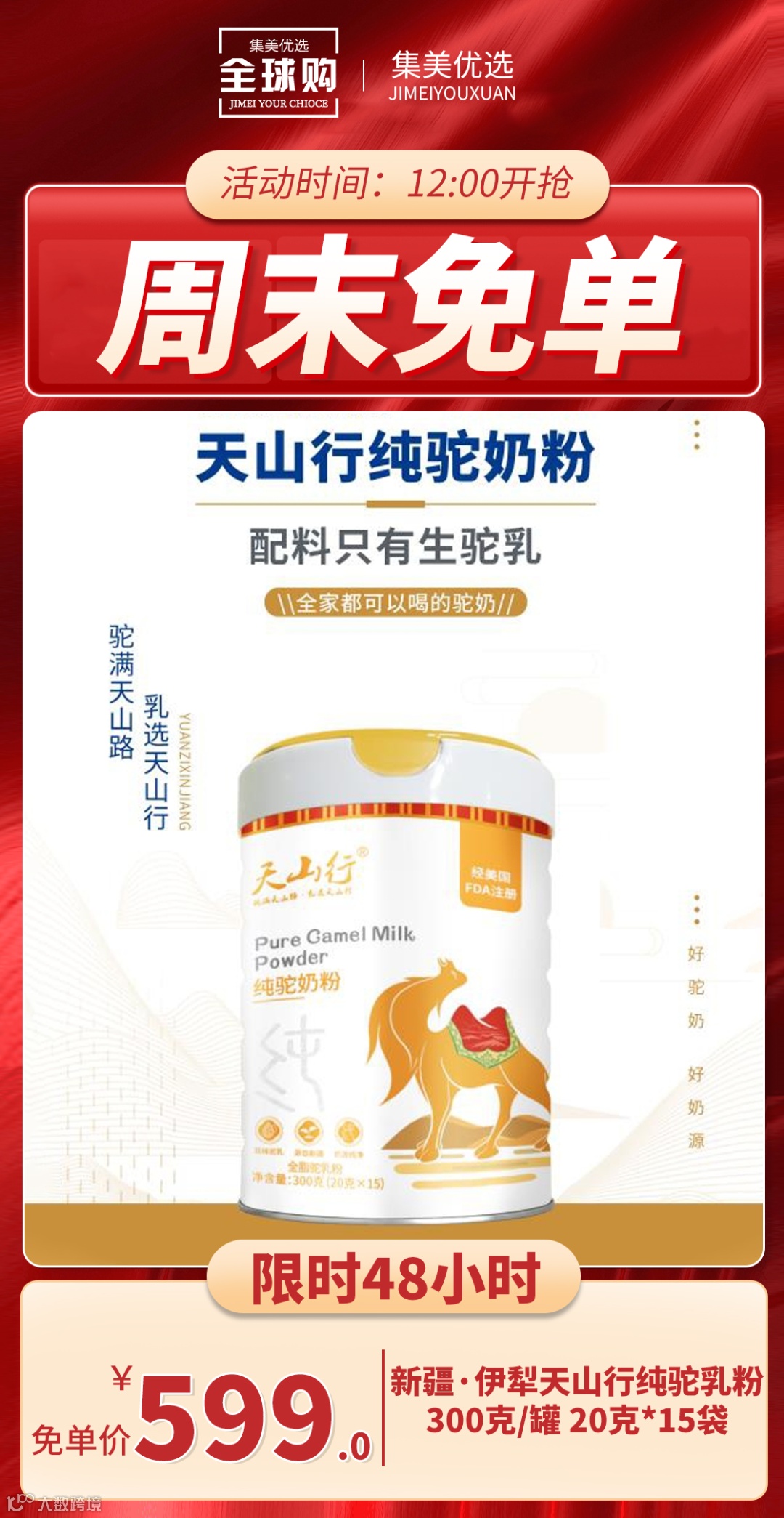 【周末免单】新疆·伊犁天山行纯驼乳粉300克/罐 20克*15袋 原价:799元 粉丝群补贴价:599元