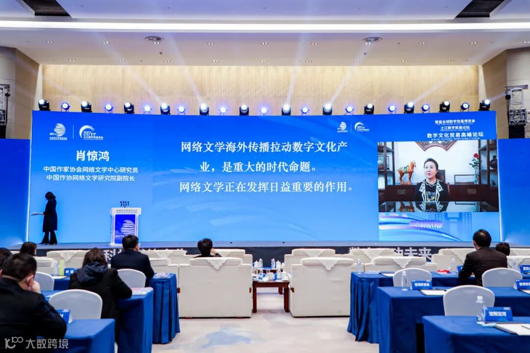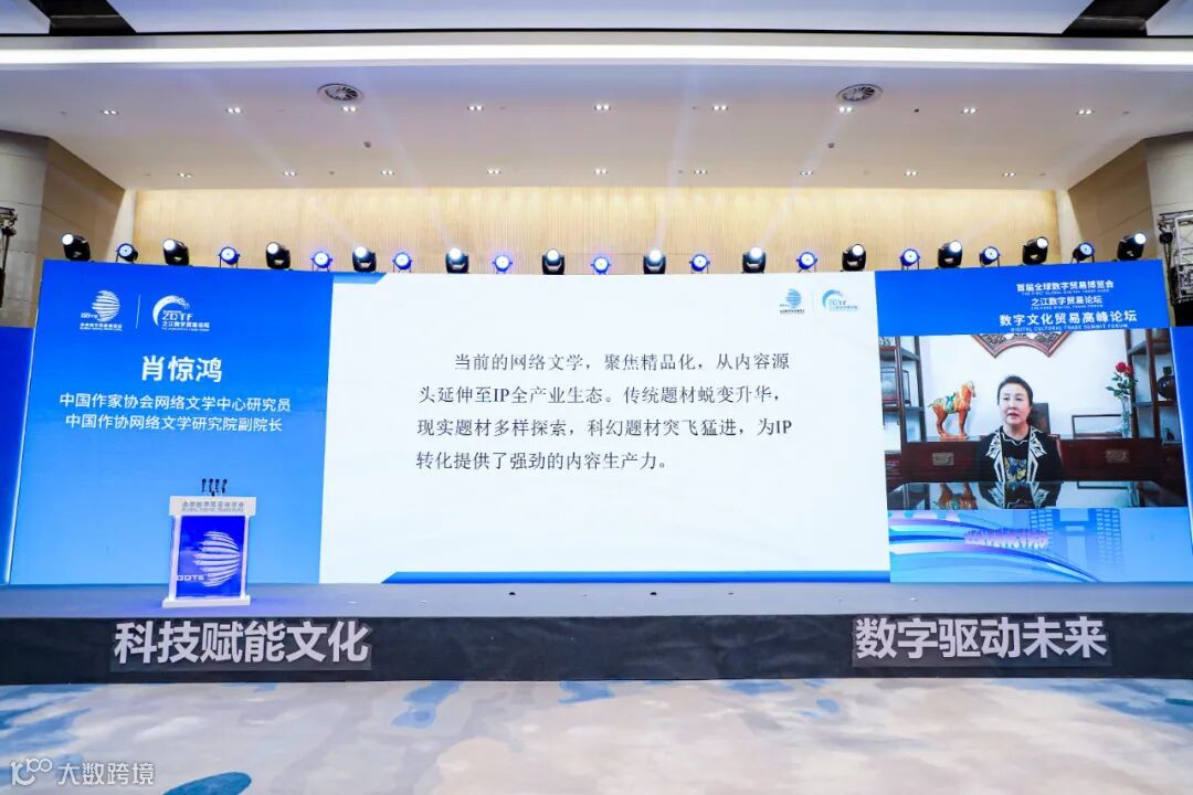 12月12日,由浙江省人民政府、商务部、中央宣传部主办,浙江省商务厅、浙江省委宣传部、浙江省文化和旅游厅承办的全球数字贸易博览会数字文化贸易高峰论坛在杭州国际博览中心举办。中国作家协会网络文学中心研究员、中国作协网络文学研究院副院长肖惊鸿在论坛上发表了主题演讲。以下为演讲节选。