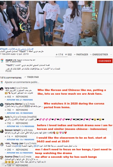 阿语频道播放数据显示,中国现实题材电视剧,尤其是当代青春题材电视剧,受到阿拉伯观众较为普遍的欢迎。如,讲述青春成长故事的《甜蜜暴击》和《最亲爱的你》在阿语频道点击量排名第一第二,分别达1400万次、700万次。大量用户在评论区留言以表达对中国剧集的喜爱。用户莱斯说:“剧终了好伤心。希望有第二季!”,粉丝埃米尔说,“很甜很棒的剧,尤其是男女主CP,太喜欢了。”还有一些粉丝喜欢中国电视剧和韩剧,拉娜留言说“作为阿拉伯地区的粉丝,我很喜欢看韩剧和中国剧”。