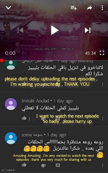 一些身在埃及、阿尔及利亚、伊拉克地区的阿语观众也加入到追剧行列。为了纪念观剧体验,粉丝们纷纷将自己的感受和心情在评论区与大家分享。网友仿生羊说:“这是我看过的最好看的频道”,网友苏摩说:“非常感谢带给我们这么多精彩的内容,你们的频道太有魅力了”,“请千万不要推迟更新,我正兴奋地追看呢”……
