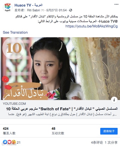 阿拉伯语频道与当地字幕组积极合作,完成视频的翻译和上传等工作。字幕组成员是阿拉伯当地居民,他们既是中国文化爱好者和中文学习者,也是频道的主要粉丝。因此,他们不仅掌握着良好的中阿双语技巧和文化知识,熟练地掌握着当地语言的用语习惯和禁忌,而且非常了解阿语地区观众对中国电视剧的观看兴趣和对华语明星的追星情况。通过与阿拉伯地区本土化团队的合作,频道与当地观众建立了更加快捷高效的双向互动,逐渐达到了较为理想的传播效果。