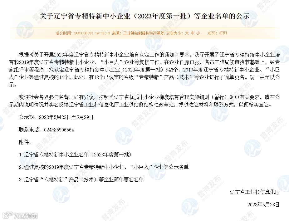 辽宁省工业和信息化厅公布