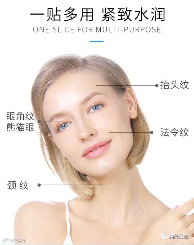 专利膜材基质 采用水凝胶工艺 更呵护 更吸收 更有效 亲肤透气不粘腻 深层滋养肌肤亲肤透气,单向渗透,同时补充胶原蛋白,增强眼部皮肤弹性,并缓解干纹细纹黑眼圈症状,提升眼部肌肤轮廓