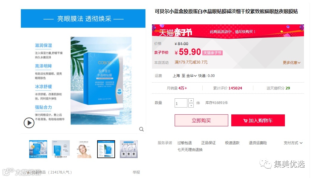 【大牌团购】可贝尔小蓝盒胶原蛋白水晶眼贴膜 10对/盒 3盒 原价:179元 大牌团购价:69元 COBOR/可贝尔小蓝盒胶原蛋白水晶眼贴膜