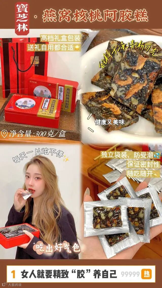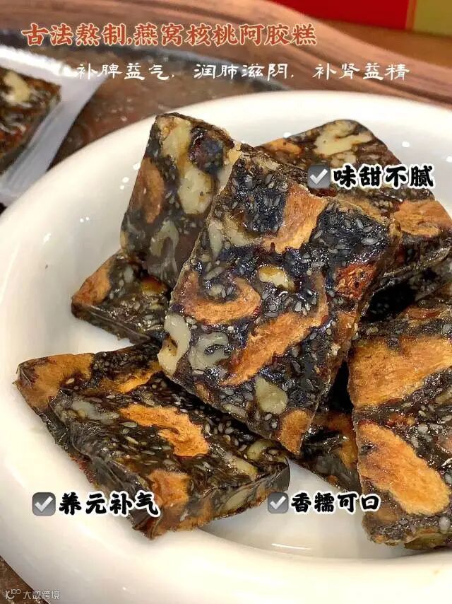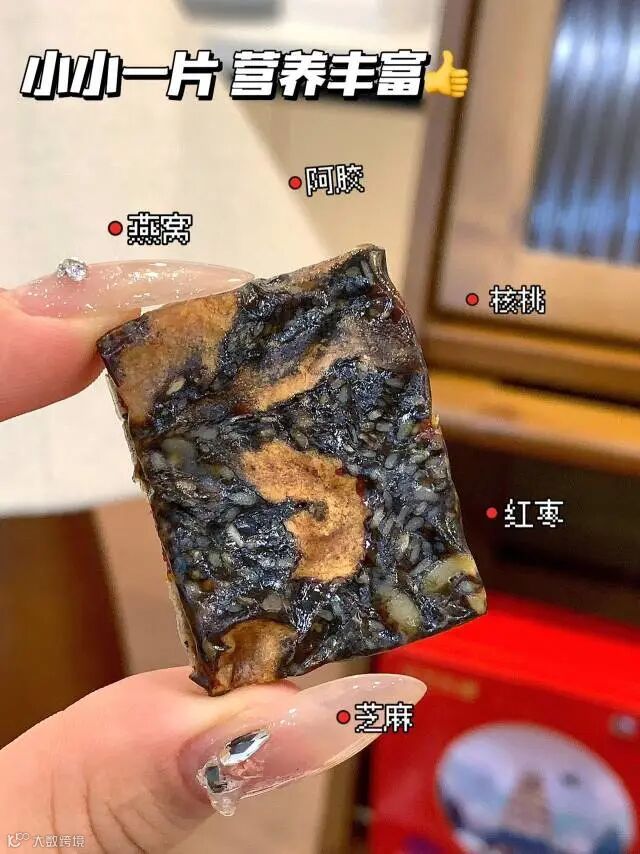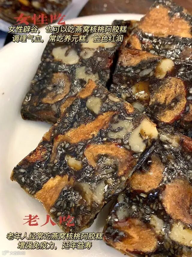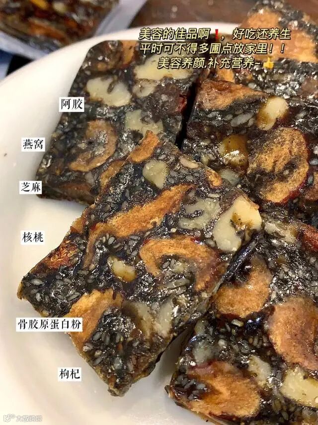 【配料】黑芝麻、红枣 、核桃仁、骨胶原蛋白粉、麦芽糊精、枸杞、黄酒 冰糖、燕窝、阿胶