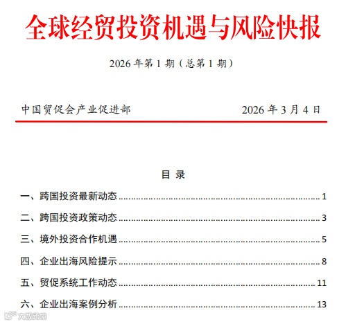 为落实《全国贸促系统“走出去”专项工作实施方案(试行)》,经会领导批准,中国贸促会产业促进部委托中国贸促会商事法律服务中心,自2026年2月起每月编发1期《全球经贸投资机遇与风险快报》,系统梳理境外投资政策和商业机会,实时反映贸促系统专项工作动态,结合典型案例提炼应对经验,帮助出海企业预判风险、抢抓商机,更好开展境外投资决策。