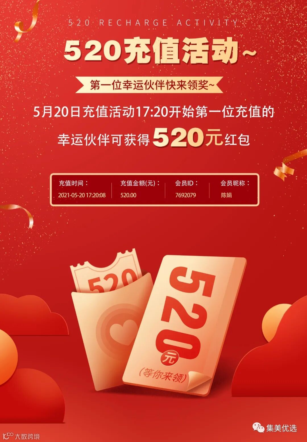集美520充值活动第一位幸运伙伴快来领奖~