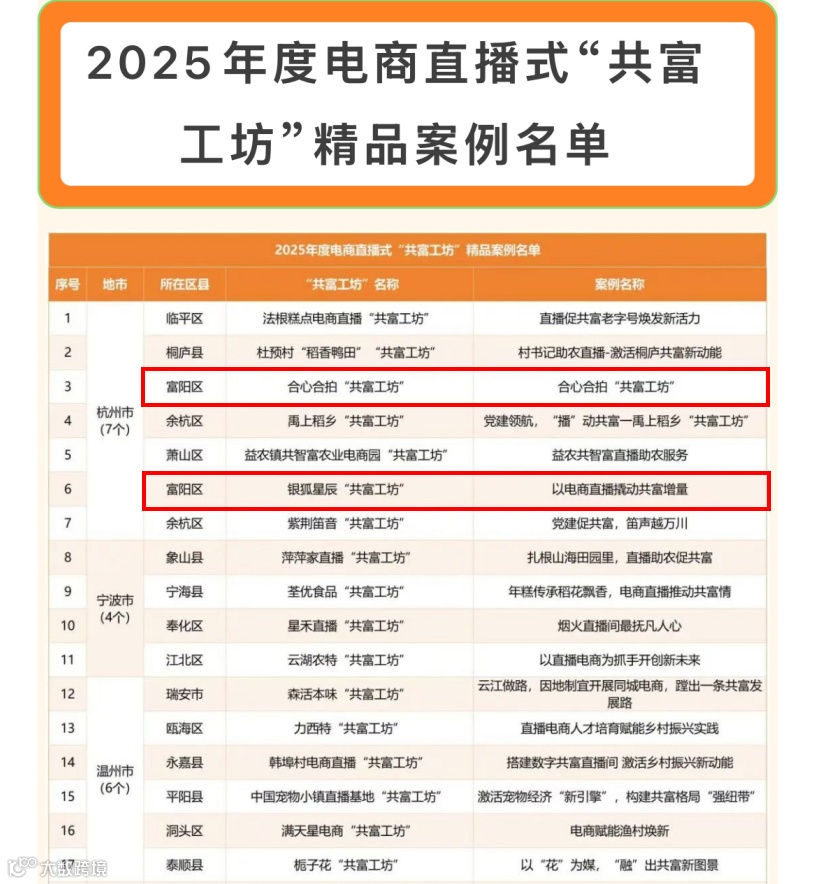 近日,在全省党建引领电商直播式“共富工坊”建设提质增效交流活动上,公布了浙江省 2025年度电商直播式“共富工坊”精品案例认定结果。杭州市共有7家工坊获评,其中,我区合心合拍共富工坊、银狐星辰共富工坊上榜,取得可喜佳绩!