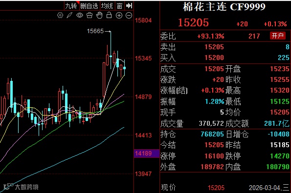 3月4日,郑棉主力合约收于15205元/吨,涨20元。