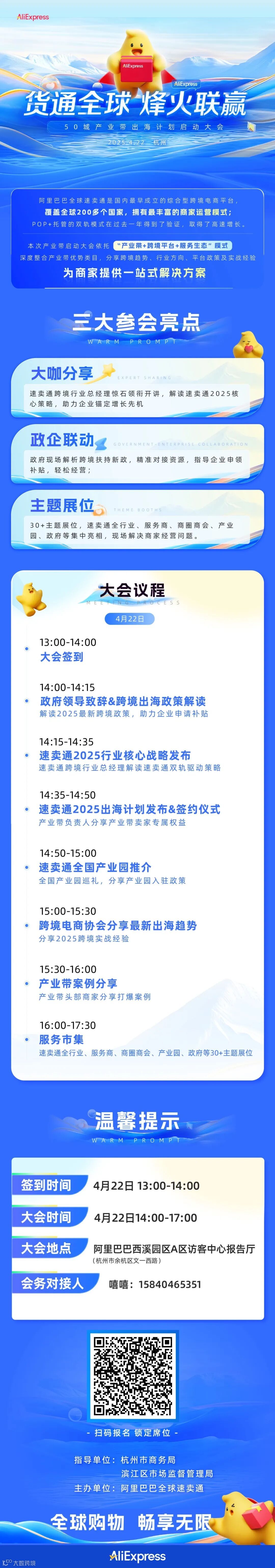 为了帮助传统外贸企业、跨境电商企业加快开拓新市场、上线新站点,实现多元化、品牌化、全球化发展,加速推进企业踏云出海,富阳区商务局发挥资源枢纽作用,链接企业与跨境平台,本次为各位带来速卖通【货通全球 烽火联赢】--杭州站,欢迎各位扫描下方二维码报名!